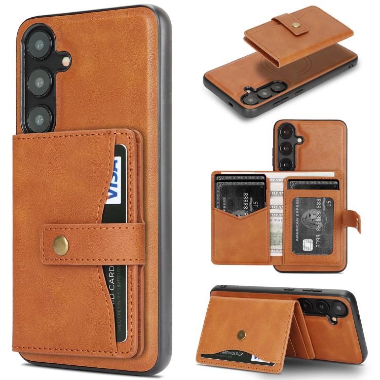 For Samsung Galaxy S24 5G Kalebol Magnetic Button Card Bag MagSafe Ring Leather Phone Case(Brown)