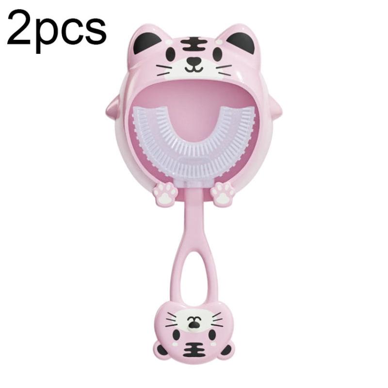 S8 2pcs Children Cartoon Animal Manual U-shaped Silicone Toothbrush for 2-12 Years Old(Pink Tiger)